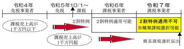 インボイスの登録をしたために課税事業者となった場合には、簡易課税届出についても特例があり適用を受ける課税期間の末日までに、消費税簡易課税制度選択届出書を提出することで、簡易課税制度を選択することができます。(簡易課税の選択にかかわらず2割特例は適用可能)