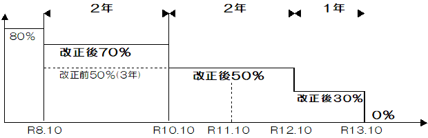 免税事業者など適格請求書発行事業者以外の者からの課税仕入れにつき、その一定割合を控除できる経過措置について、適用期限を2年間延長した上で、 以下のとおり控除可能割合が見直されました。